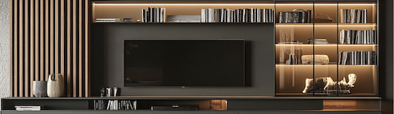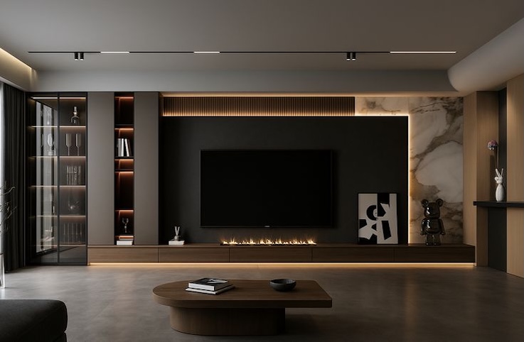 Custom media walls with integrated lighting, concealed storage and AV management.